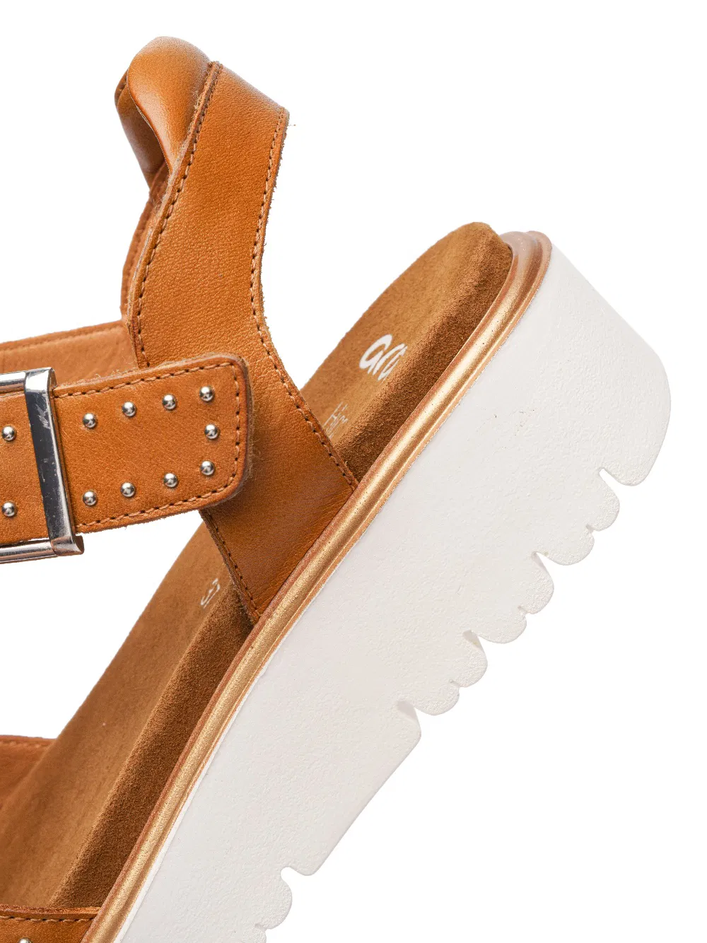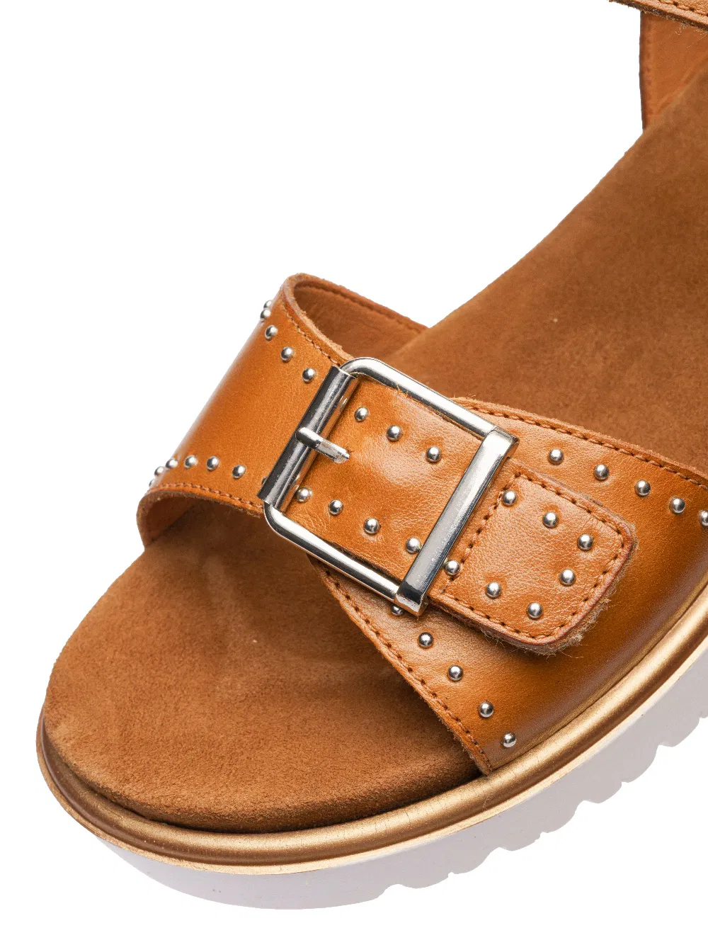 La semelle compensée marquante, la boucle décorative métallique et les ornements rivetés élégants de ces sandales attirent particulièrement les regards.