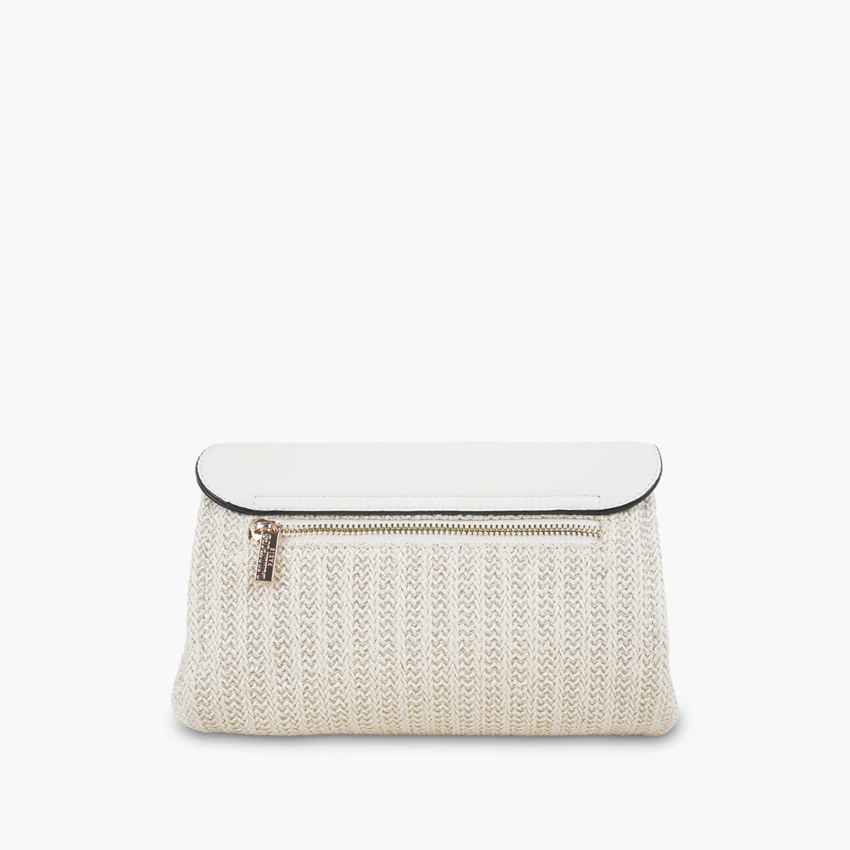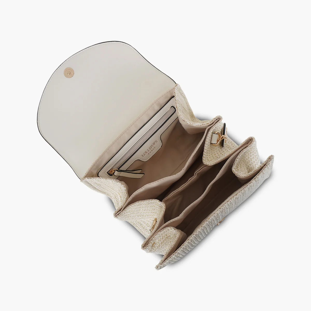 Sac multipoches bimatière en simili cuir blanc et en paille papier avec fils métallisés